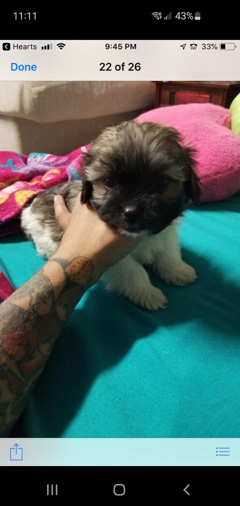 Meet Cruella the female shihpoo born January 10th 2025 . White and black/brindle patches. She is up to date on shots and dewormings. Ckc registered.